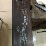 La marquetería la encontramos en el cajón superior en los bajantes y en las patas de la cómoda.