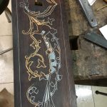 En este caso la chapa de madera es de palisandro y la incrustación de zinc.
