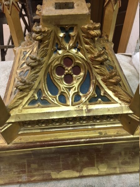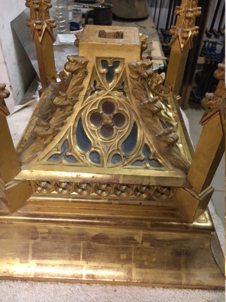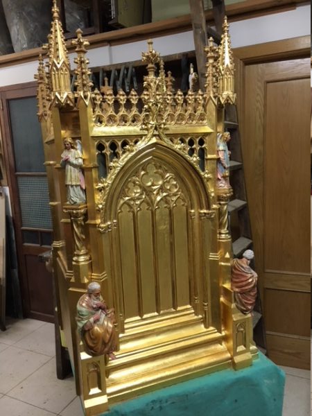Tallado en madera de pino y tilo, está acabado con pan de oro de 22 quilates y todas las figuras talladas están policromadas.