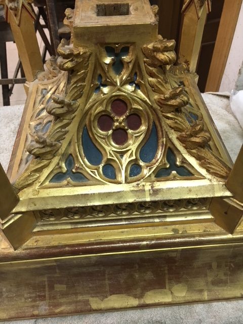 Tallado en madera de pino y tilo, está acabado con pan de oro de 22 quilates y todas las figuras talladas están policromadas.